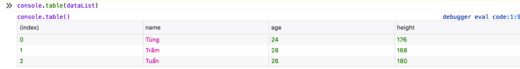 Truyền vào một object, console.table sẽ “log” cho bạn một kết quả dễ đọc dạng bảng.