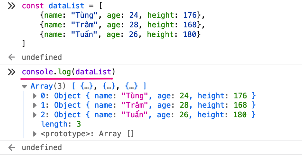 Có console rồi thì thường chúng ta sẽ dùng console.log để log ra giá trị mà debug, rất đơn giản.