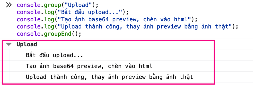 Phù hợp để nhóm nhiều lần nội dung lại với nhau và hiển thị ra một lần theo dạng nhóm. Bạn dùng console.group để bắt đầu một group, dùng console.groupEnd để kết thúc group.