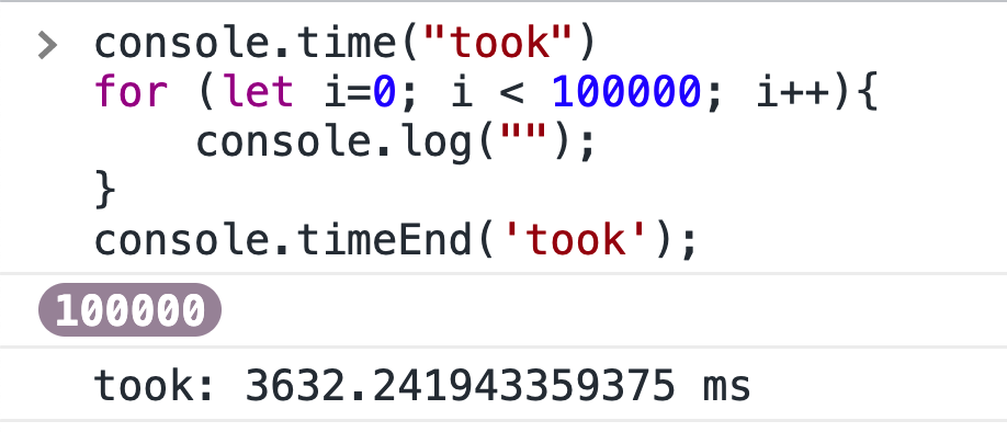 Thường dùng để đo thời gian chạy của một hàm / một khối lệnh (hiển nhiên bạn có thể dùng console.log với Datetime nhưng cách này nhanh hơn, nhanh hơn thế nào? xem hình nhé. Kết quả được tính bằng ms.