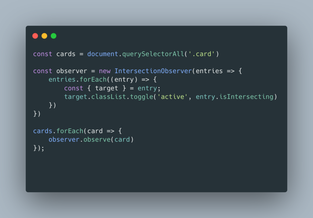 Như bạn thấy, Class IntersectionObserver nhận vào một callback, tại đây, bạn nhận các đối tượng (trong biến entries) và kiểm tra xem nó có đang “in view” hay không. Ví dụ: