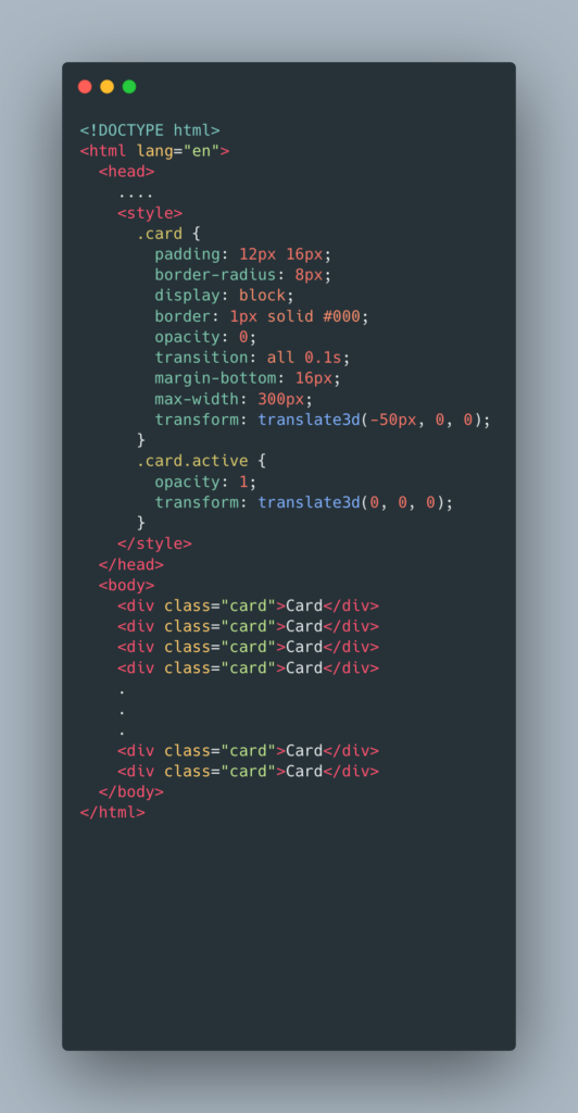 Các card này trong trạng thái bình thường sẽ ẩn (opacity = 0) và lệch về bên trái -50px, khi có thêm class active Card sẽ hiện lên từ từ (opacity = 1) và chuyển động về bên phải 50px (translateX từ -50px -> 0).